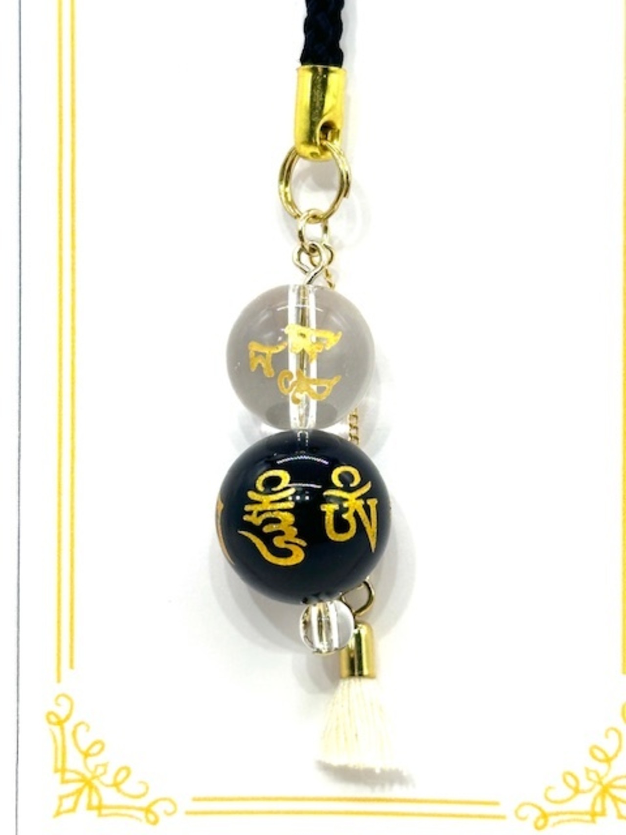 神秘的な力が宿る根付け「根付け 9589」。この魅力的なアイテムは、ブラックオニキスの14㎜玉に観音菩薩の六字真言が刻まれ、水晶の12㎜玉には三面大黒天の梵字が施されています。ブラックオニキスは、身を守る力を持ち、心のバランスを整えるサポートをしてくれます。また、水晶は浄化と癒しのシンボルとして知られ、身につけることでさらなるエネルギーを引き寄せます。チャームにはエレガントな白色タッセルがあしらわれ、持ち主の魅力を引き立てる存在感を放ちます。